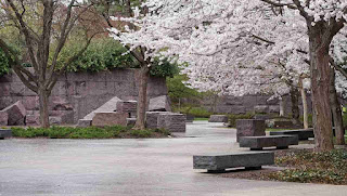 Unfortunately, the clouds were low and heavy, so there was no pretty sunrise. That didn't stop me from walking along the tidal basin for a bit to enjoy the blossoms. Since I parked fairly close to the Roosevelt Memorial, I made my way through the sprawling memorial, and took my time to photograph along the way.